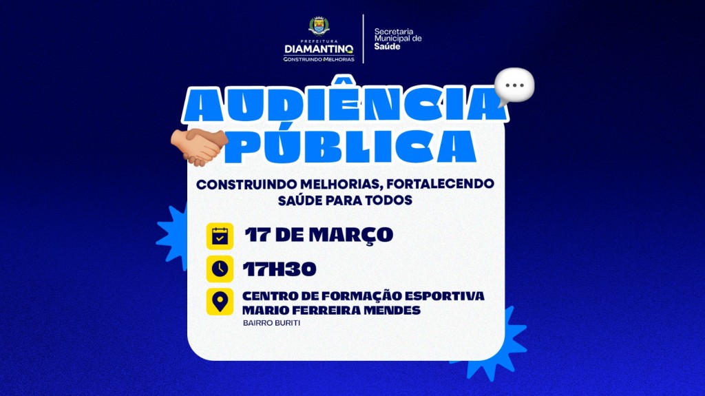 A Prefeitura de Diamantino, por meio da Secretaria Municipal de Saúde, realizará no dia 17 de março de 2026, às 17h30, a audiência pública “Construindo