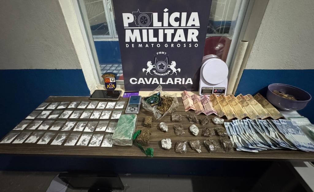 Em Lucas do Rio Verde, durante patrulhamento no bairro Vida Nova, a equipe flagrou três homens em atitude suspeita em frente a uma residência. Um deles tentou fugir ao ver os policiais. Na abordagem, foram encontrados meio tablete de maconha e mais 14 porções da mesma droga, além de uma balança de precisão e uma quantia de R$ 300 em dinheiro.