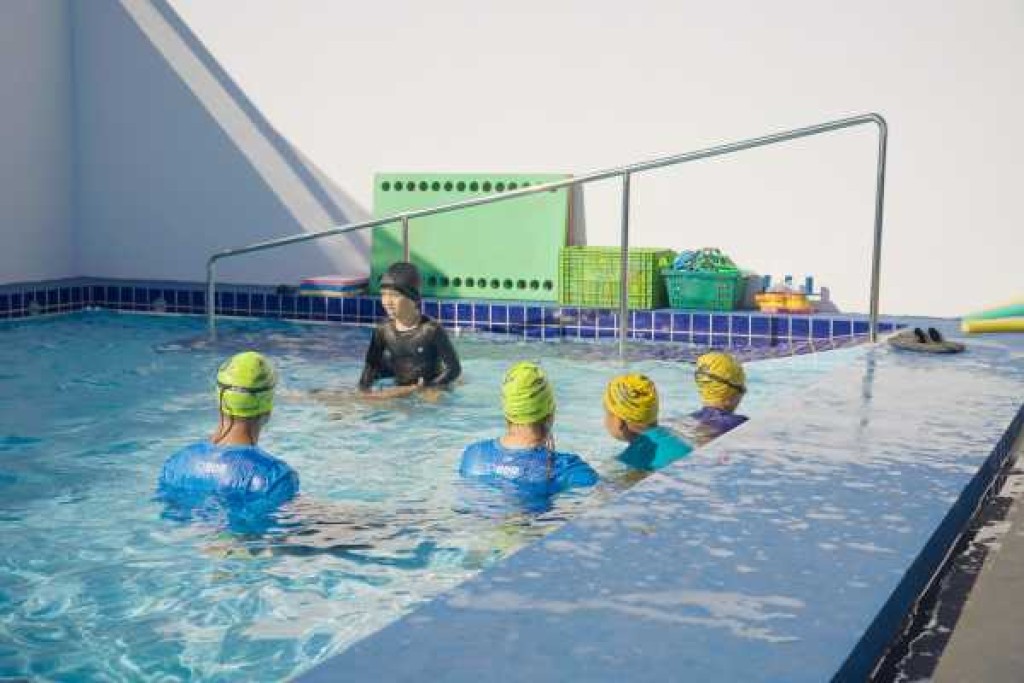 Essa é a primeira piscina adaptada para o atendimento de alunos PCDs implementada no projeto, e conta com dois níveis de profundidade. O primeiro de 80 centímetros e o segundo de 1,40 metro. Por isso, sua estrutura conta com duas rampas, uma de acesso e outra que possibilita a transição para a área mais funda. Também foram instaladas barras laterais, corrimão e um sistema de aquecimento elétrico, que mantém a temperatura estável.