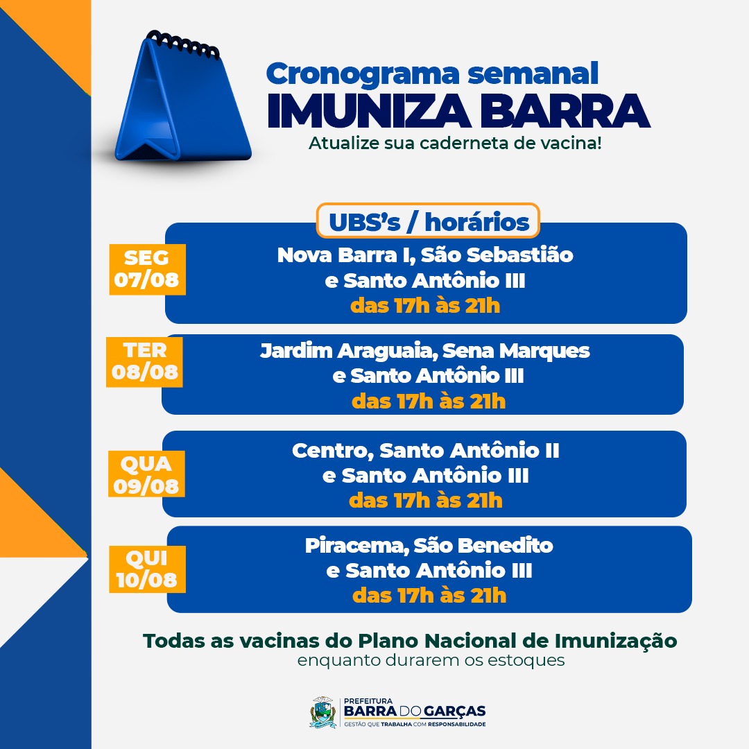 A Prefeitura de Barra do Garças por meio da Secretaria Municipal de Saúde promove até o dia 10 de agosto, o Imuniza Barra, projeto para atualização do calendário vacinal da população. A ação é voltada para o público em geral, crianças e adultos, que estejam com vacinas em atraso ou que não completaram o cronograma de imunização.