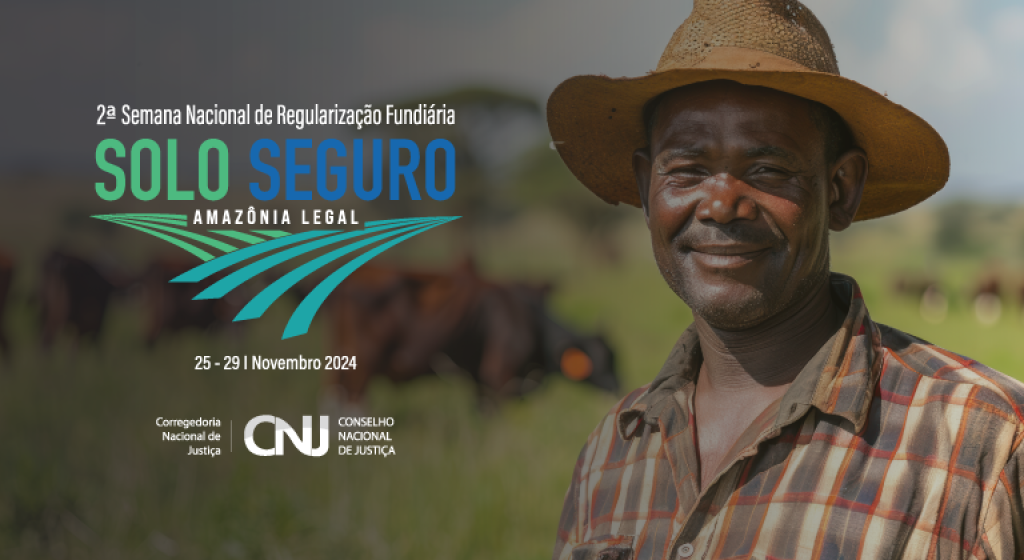 #ParaTodosVerem: esta matéria possui recursos de texto alternativo para promover a inclusão de pessoas com deficiência visual. Foto 1: peça publicitária mostrando um homem negro com chapéu de palha e camisa xadrez, tendo ao fundo uma fazenda com bois desfocados. No canto direito, está a logo da 2ª edição da Semana Nacional de Regularização Fundiária Solo Seguro – Amazônia Legal, com a data 25-29 de novembro de 2024.