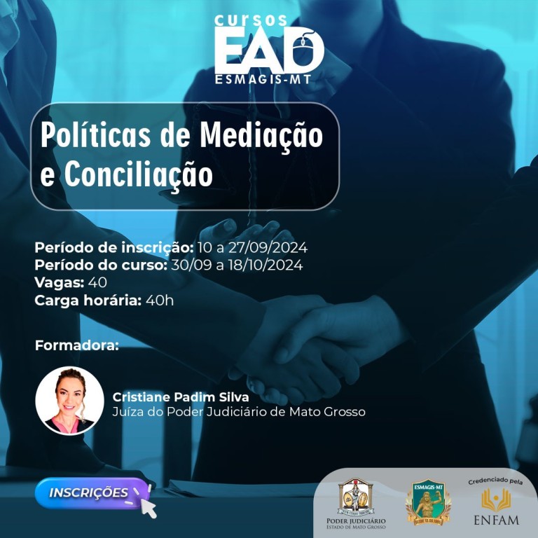 Atenção, magistrados e magistradas! A Escola Superior da Magistratura de Mato Grosso (Esmagis-MT) informa que estão abertas as inscrições do curso “Políticas de Mediação e Conciliação”. Credenciado pela Escola Nacional de Formação e Aperfeiçoamento de Magistrados Ministro Sálvio de Figueiredo Teixeira (Enfam), a capacitação é válida para fins de vitaliciamento e/ou promoção de magistrados(as).A curso será ofertado de 30 de setembro a 18 de outubro, via plataforma Moodle (EAD), podendo ser acessado 24h por dia, em horário livre. Ao todo, a carga horária é de 40 horas/aula. Foram disponibilizadas 40 vagas, sendo que o período de inscrição segue aberto até o dia 27 de setembro.