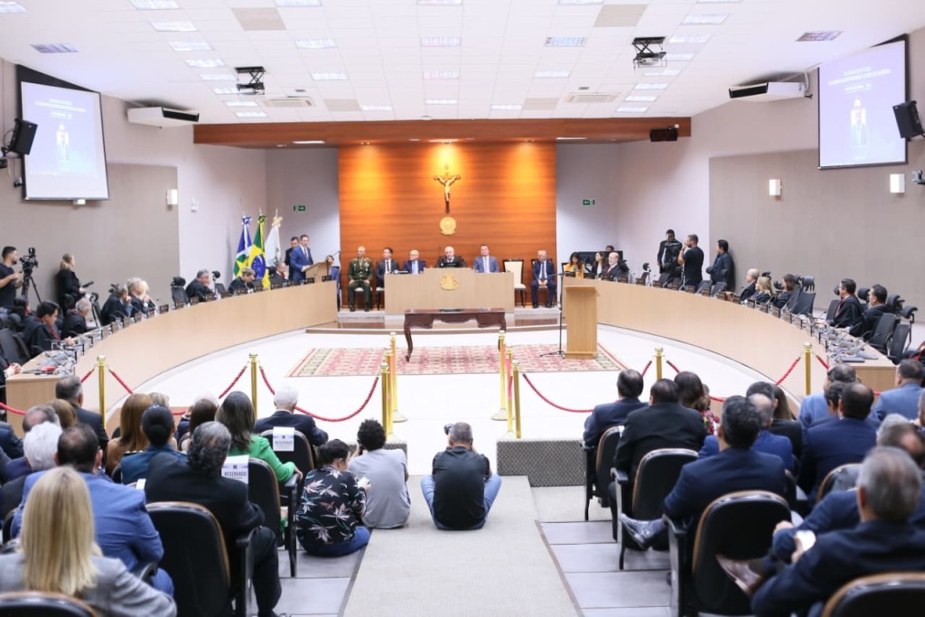A foto ilustra o Procurador Geral do Município, Luiz Antônio Araújo Júnior, vestido de terno e gravata dourada. No fundo, é possível visualizar o pleno do Tribunal de Justiça no qual desembargadores marcam presença. Do lado esquerdo e direito, estão advogados e autoridades prestigiando uma solenidade de posse.