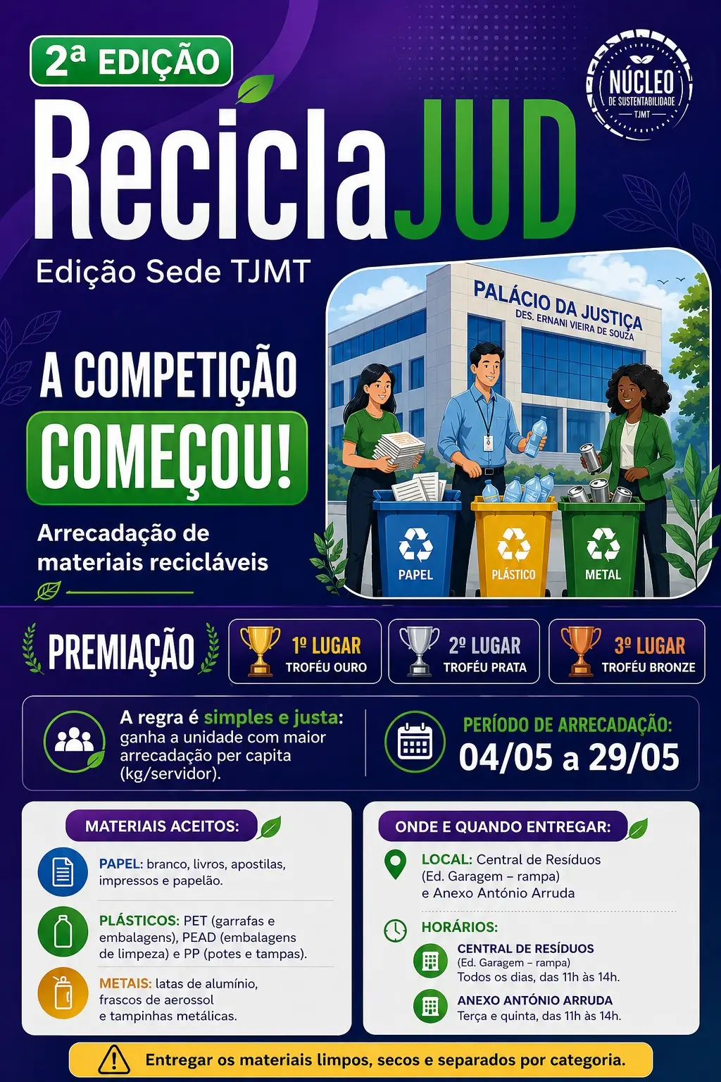 A campanha será realizada entre os dias 4 e 29 de maio de 2026 e envolverá todas as unidades administrativas e judiciárias da sede do TJMT. Durante esse período, os participantes poderão arrecadar e entregar materiais recicláveis, contribuindo não apenas para a preservação ambiental, mas também para o fortalecimento de ações sociais.