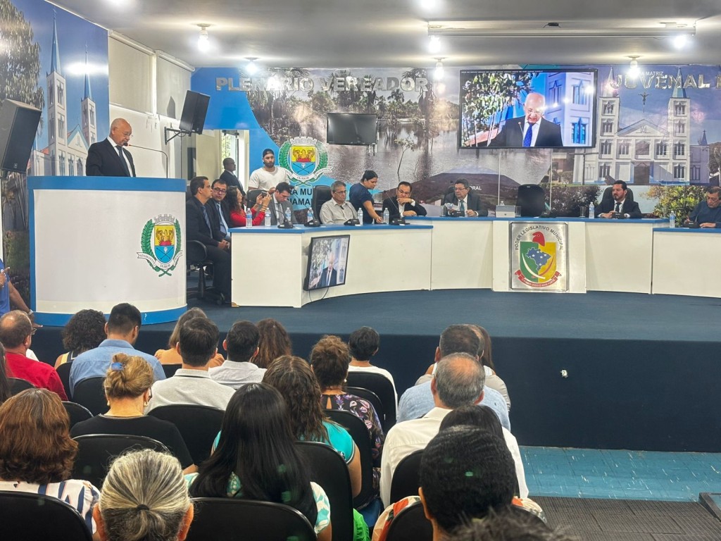 Paratodosverem. Esta matéria possui recursos de texto alternativo para promover a inclusão das pessoas com deficiência visual. Descrição de imagem. Foto 1 – Plenário da Câmara de Vereadores de Diamantino lotado para solenidade de entrega de títulos. No púlpito, corregedor discursa ao lado do dispositivo de autoridades. Foto 2 – corregedor entrega o título a dona Ivanir.