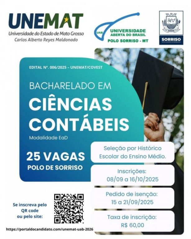 O Polo da Universidade Aberta do Brasil (UAB) de Sorriso foi contemplado com vagas no curso de Bacharelado em Ciências Contábeis, ofertado pela Universidade do Estado de Mato Grosso (Unemat) na modalidade a distância. As vagas fazem parte do Edital nº 006/2025, que disponibiliza ao todo 600 oportunidades em cursos de graduação, distribuídas também para polos em diferentes municípios. O processo seletivo será realizado exclusivamente pela internet, com base no histórico escolar do ensino médio ou documento equivalente.